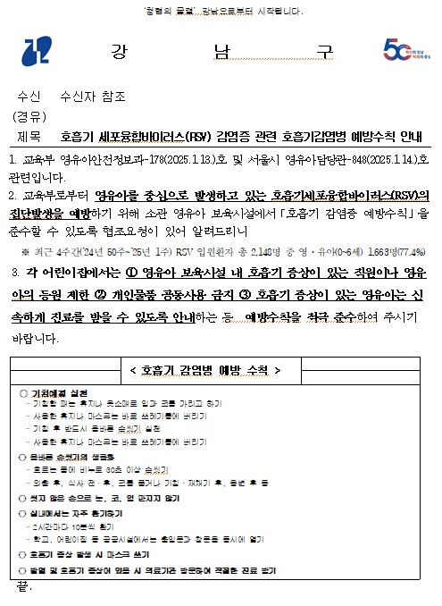 교육부로부터 영유아를 중심으로 발생하고 있는 호흡기세포융합바이러스(RSV)의 집단발생을 예방하기 위해 호흡기 감염증 예방수칙을 준수할 수 있도록 협조요청이 있어 초록어린이집 학부모님들께 알려드리니 관련 공문에 따른 예방수칙을 적극 준수하여 주시길 부탁드립니다.